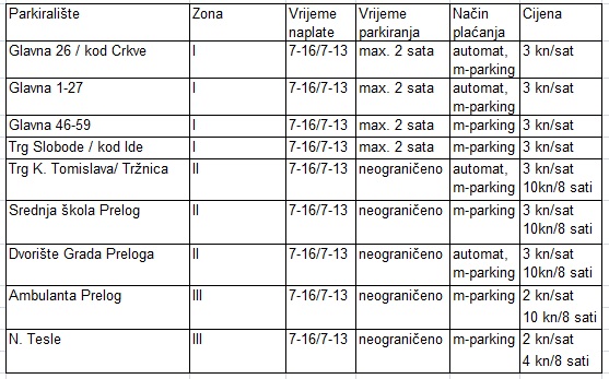 GKP PRE-KOM d.o.o Prelog obavlja naplatu parkiranja na području Grada Preloga od 18.09.2003. godine. Naplata parkiranja obavlja se na 280 parkirnom mjestu, s time da na svakom parkiralištu ima i dodatnih parkirnih mjesta za invalide.